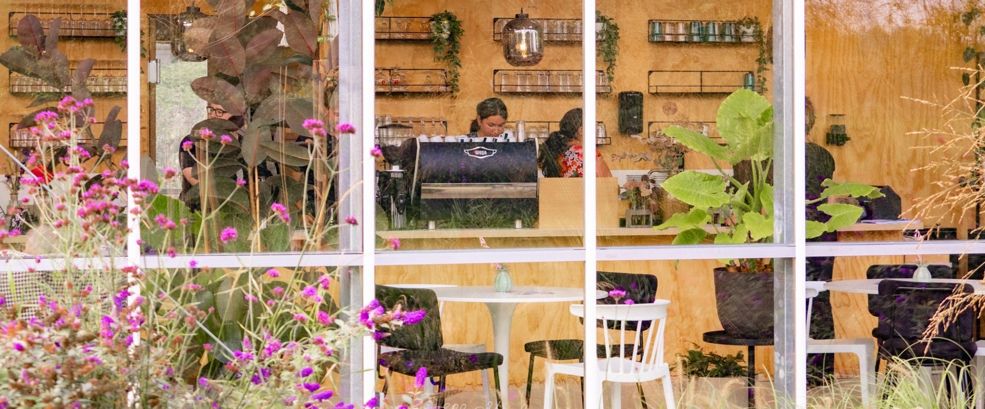 Koffie- & Theeschenkerij Binnen is Buiten is een lichte, volledig glazen ruimte, midden in het groene hart van Lelystad.